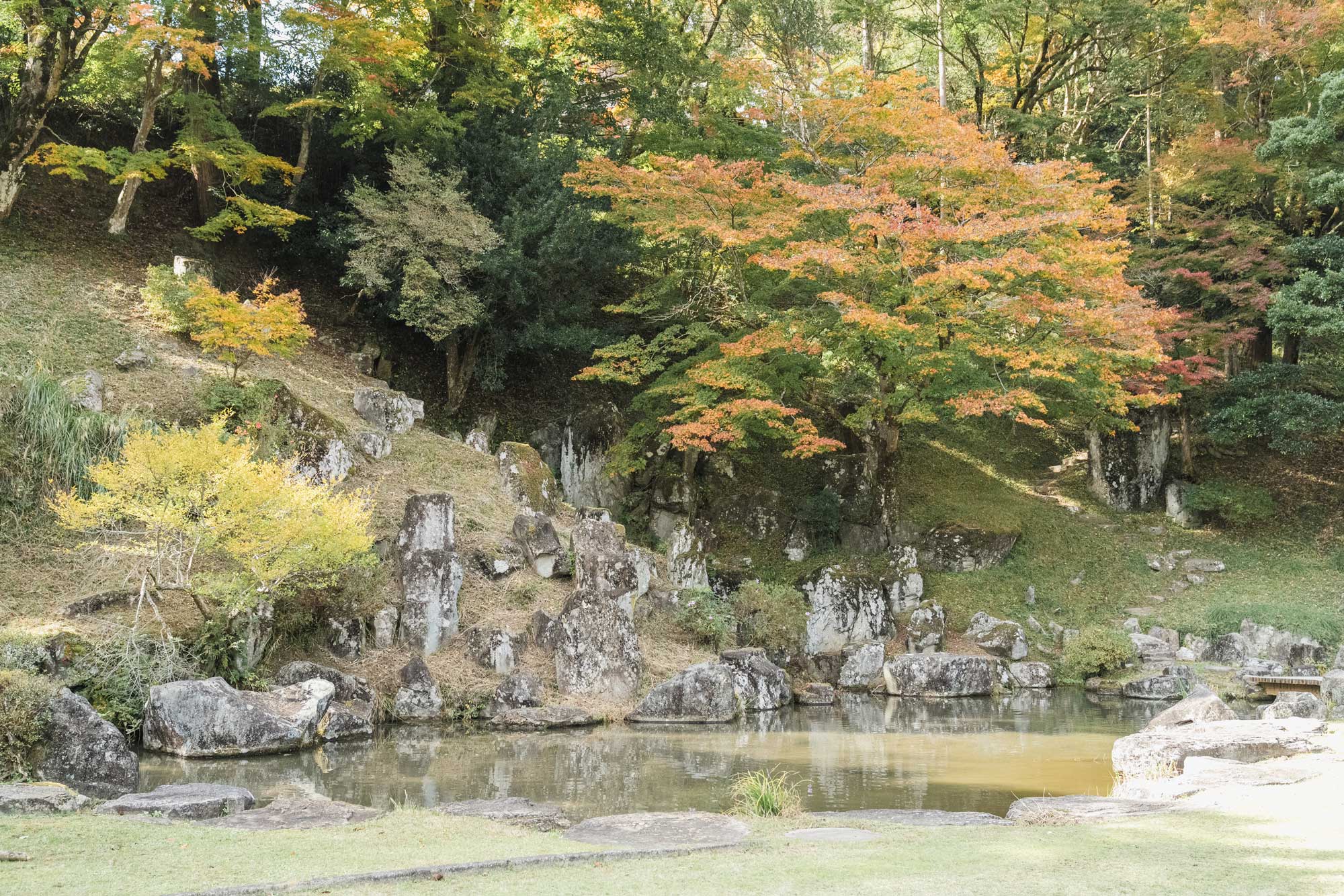 江戸時代の森藩・久留島氏陣屋跡の西側に広がる丘陵を利用して造られ 8代藩主・久留島通嘉の時代に作庭されました 庭園では 丘陵に巨石を配し 自然の地形を活かした美しい景観が広がります 庭園の中心には巨石を組み上げた枯滝が設置され 日本遺産の一部としてその歴史的価値が高く評価されています